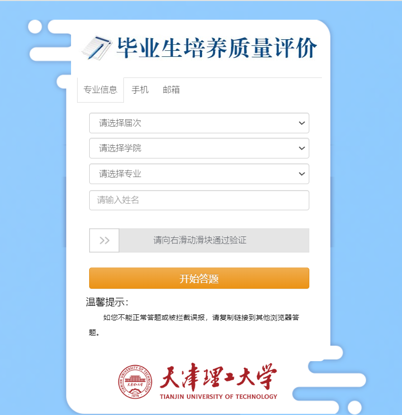 评价方式:问卷采用在线答题方式进行,答题入口将通过邮件、短信发送以及拨打电话等方式告知各位毕业生,亦可以扫描下方二维码进入答题系统,诚恳邀请大家积极参与。